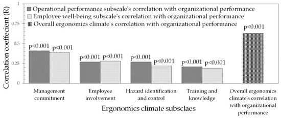 A significant correlation was observed between the overall ergonomics climate and each of its subscales with organizational performance. There was a positive and moderate correlation between the overall ergonomics climate and organizational performance (p < 0.001), as shown in Figure 5.