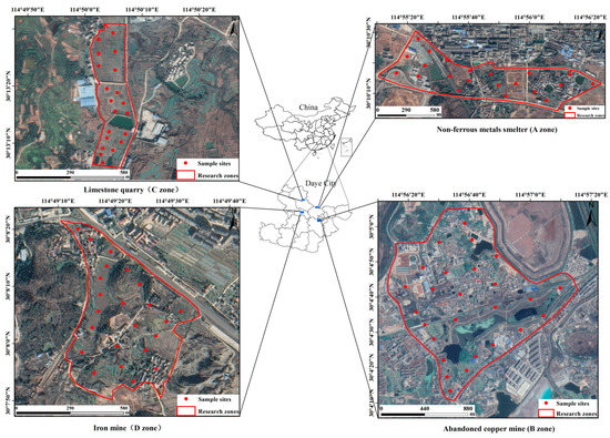 Considering the relationship between heavy metals distributions and anthropogenic emissions, the study areas can be classified into four categories of vegetable fields near the non-ferrous metals smelter (A zone), abandoned copper mine (B zone), limestone quarry (C zone), and iron mine (D zone) (Figure 1). Moreover, they are located in four townships: Xialu District, Jinhu town, Huandiqiao town, and Jinshandian town. A zone is located in Xialu District, whose north part is adjacent to the open pit and concentrator. B zone is located in Jinhu town, which has a mining area of 7.8 km2 and a long history of open-cast mining. C zone is located at the eastern foot of Taiping Mountain of Huandiqiao town, which has been affected by quarrying and transportation for years. D zone is located in Jinshandian town, which is one of Wuhan Iron and Steel (Group) Company’s large underground iron mines.