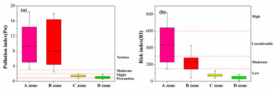Boxplot of pollution index (a) and risk index (b) for heavy metals in the four zones.