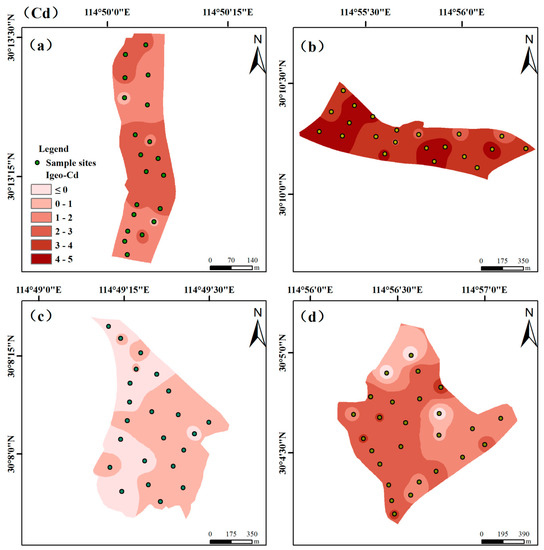 Spatial distribution pollution levels of Igeo-Cd in the four zones: (a) Non-ferrous metals smelter; (b) Abandoned copper mine; (c) Limestone quarry; (d) Iron mine.