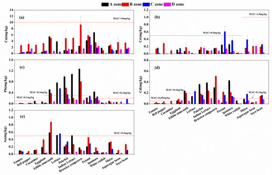 In present study, the maximum allowable concentration (MAC) of food standard (GB2762-2017) is presented in Table S3. Compared to 15 species of vegetables and crops, the highest Cu contents were found in brassica campestris (Figure 4a), which almost surpassed the MAC value, while the higher Cr content was determined in peanut (Figure 4b). Moreover, the species exceeding rates of Cu and Cr were 6.7%. According to the MAC, Pb and Cd contents in most leaf vegetables were found above the criterion line as shown in Figure 4c,d, whereas relatively low concentration was found in tomato, bell pepper, white radish, and asparagus bean. In contrast, several crop types including peanut, ipomoea, maize and soya bean showed the higher accumulation ability for Pb and Cd. So, the percentage of vegetables and crops that exceed the MAC value is 66.7% for Pb and 80.0% for Cd. For As, only 26.7% species exceed the MAC, and the contents of As in the vegetables are listed in Figure 4e, the higher value can be observed in leaf vegetables, especially in edible amaranth.