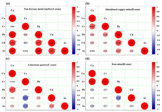 Correlation plots of heavy metals in the four zones: (a) Non-ferrous metals smelter; (b) Abandoned copper mine; (c) Limestone quarry; (d) Iron mine; * p < 0.05, ** p < 0.01.