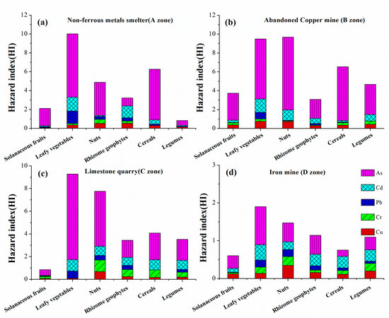 In addition, the results of health risk assessment revealed that the HI values of four zones through consumption of vegetables and crops were >1, revealing that the local children near mining and smelter regions suffer a higher non-carcinogenic risk. In contrast, the consumption of solanaceous fruits could cause a low potential health risk, which suggested that low accumulation species should be selected and applied on contaminated agricultural soils. Thus, adjustment of planting structure or conversion of land use should be adopted to protect human health and ensure food safety.