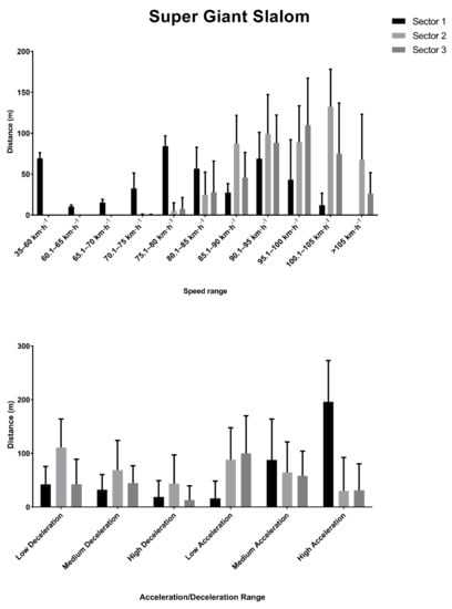 For each skier, the total distance covered was measured. This was divided into the different sectors based on the event (super-giant slalom and giant slalom had three sectors, while slalom had two). The distances covered in each sector was divided based on different speed thresholds: 35–60 km·h−1, ranges of 5 km·h−1 from 60 km·h−1 to 105 km·h−1 and >105 km·h−1 for super-giant slalom; 35–60 km·h−1, ranges of 5 km·h−1 from 60 km·h−1 to 85 km/h, and >85 km·h−1 for giant slalom; and 25.1–35 km·h−1, ranges of 5 km·h−1 from 60 km·h−1 to 70 km·h−1 for slalom. Additionally, the distances covered in these sectors during accelerations and decelerations were recorded, and these were classified in three categories: low accelerations or decelerations (between 0 and ±1.75 m·s−2), medium accelerations or decelerations (between ±1.76 and ±3 m·s−2) and high accelerations or decelerations (above ±3 m·s−2).