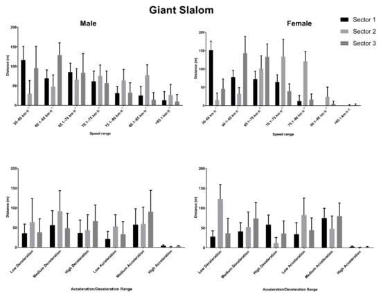 Seven male and six female skiers completed the two runs of the giant slalom event of the competition, while two male competitors completed a single run. The average total distance covered by the males was 1242.10 ± 41.73 m while for females was 1229.15 ± 27.23 m. On a sector-by-sector basis, the distance covered in Sector 1 was 422.15 ± 46.82 m for males and 399.88 ± 11.86 m for females, in Sector 2 it was 394.24 ± 95.10 m for males and 437.66 ± 58.59 m for females, and in Sector 3 it was 425.70 ± 35.01 m for males and 391.61 ± 52.01 m for females. The distances covered in these sectors at the different speed and acceleration thresholds are shown in
