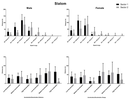 Six male and three female skiers completed the two runs of the slalom event of the competition, while three male and three female competitors completed a single run. The total distance covered by the males was 532.74 ± 117.29 m, while for females it was 570.56 ± 133.49 m. On a sector-by-sector basis, the distance covered in Sector 1 was 275.66 ± 31.80 m for males and 275.32 ± 63.28 m for females, and in Sector 2 it was 257.07 ± 99.99 m for males and 297.34 ± 84.22 m for females. The distances covered in these sectors at the different speed and acceleration thresholds are shown in