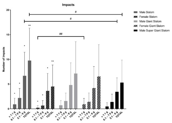 Impacts were measured by G-forces that the skiers experienced during their movements during the competition. This value represents the sum of the vector of G-forces the skier experienced in the vertical, antero-posterior, and medio-lateral axes. The impact value was registered when the G-forces of the movement exceeded 5 g [