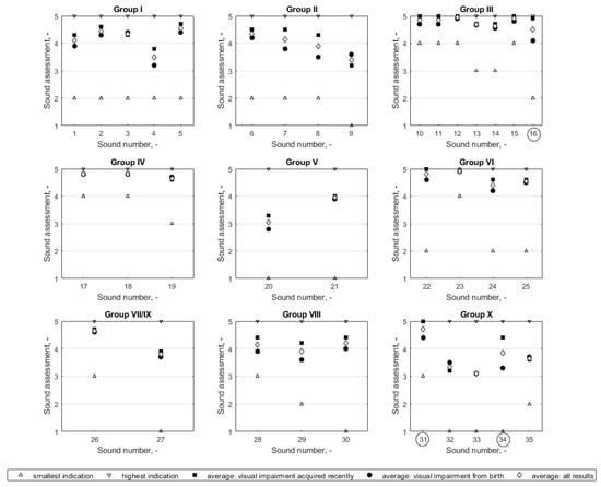 Evaluation of the proposed sounds. Sound numbers written inside the circles (16, 31, and 34) indicate cases when the differences between the average results of people who had a visual impairment since birth and who had developed an impairment relatively recently are statistically significant. Sound number designations: 1—an object falling onto a floor covered and not covered by carpet, 2—water dripping from a tap or shower head that is not completely off, 3—ring signal from a door entry phone, 4—conversations or sounds, e.g., from a radio heard through a wall, 5—knocking on a door, 6—steps on a staircase (sound reflections), 7—dog barking, 8—closing a gate, 9—low-flying passenger aircraft, 10—being surrounded by moving single-track vehicles (e.g., a scooter), 11—surrounded by moving two-track vehicles (e.g., passenger cars, trucks), 12—in the vicinity of moving rail vehicles (e.g., tram), 13—when staying on the pavement near a street with heavy traffic, at different distances from the street, e.g., 5 m, 10 m, 14—list of sounds present in the vicinity of streets with different traffic intensities, 15—signaling device at a pedestrian crossing, 16—bicycle bell, 17—a public bus pulling up to a stop, 18—the sound of a tram as it comes to a stop, 19—closing door of a public transport bus/tram, 20—engine operation, various types of vehicles, distinguishing between gasoline or diesel engines, 21—opening and closing a vehicle (car) door, 22—clapper sound, 23—a tram bell, 24—a signal to warn that a vehicle is driving backwards, 25—emergency vehicle signals, 26—vertical communication (passenger lifts), 27—reverberation in a building, 28—a xerograph or printer calibration suddenly starting, 29—a document being printed, 30—telephone ringing, 31—sound of a cyclist/person on rollerblades approaching on a cycling path, 32—bird sounds, 33—wind noise in the leaves of trees, 34—lawnmower powered by an internal combustion engine, 35—sounds coming from a playground for children.
