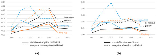 Trends of the industrial linkage coefficients of the national average, Guangdong, and Zhejiang between the finance and environmental protection sectors: (a) direct and complete consumption coefficients; (b) direct and complete allocation coefficients.