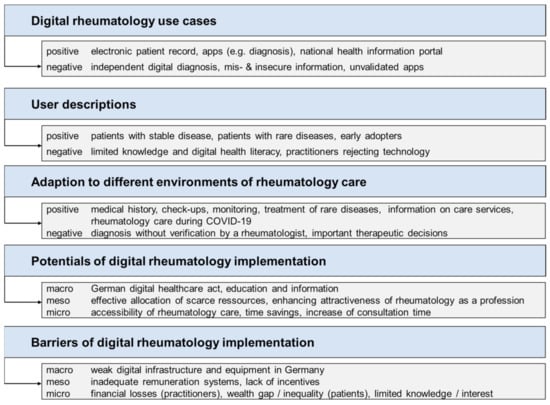 Step 1: Two scientists with a background in healthcare science (F.M., male, PhD) and social science (S.K., female, M.Sc.) independently examined the material line by line, coded inductively with regard to the content (thematic coding) and formulated as closely to the notes as possible. Additionally, codes were scaled in accordance with Kurkowski et al. []. Formal and scaled codes were assigned simultaneously and deductively to matching text sections. Positive and negative connotations were differentiated (scaling). Codes were scaled to the category “positive rating” if they contained clearly positive expressions (e.g., “ideal,” “great opportunity”), whereas the codes were scaled as “negative” if they expressed a clearly negative connotation (e.g., “we do not wish,” “a negative example”). If codes could not be assigned to a positive or negative scaling, they were not considered in the further analysis. Step 2, after approximately 70% of the material was coded, the two scientists (F.M. and S.K.) exchanged their codes and compared their codes and assignments. After this, they defined the main categories and subsumed relating codes. The main categories represent the central themes and aspects of the discussion: (1) digital rheumatology use cases, (2) user descriptions, (3) adaptation to different environments of rheumatology care, and (4) potentials of and (5) barriers to digital rheumatology implementation (Figure 3). The categories, potentials (4), and barriers (5) of digital rheumatology implementation were grouped into micro, meso, and macro levels. Codes were assigned to the macro level if they related to the German health system. The meso level referred to rheumatology care as a whole. The micro level concerned the individual patient–practitioner level. Step 3: After reworking the code system, one scientist (F.M.) coded the remaining notes. Step 4: S.K. performed an additional consistency check, and inconsistencies were resolved. To ensure validity of the data analysis, the results of the analysis were reviewed and confirmed by participants of the fishbowl discussion (M.W., H.S.K., and J.K.) before drafting the manuscript. For the presentation of the results, representative quotes of the discussion transcript were selected, translated, and included in the text. The manuscript has been compiled in accordance with the Consolidated Criteria for Reporting Qualitative Research (COREQ) [] (please refer to Supplementary Materials 1).