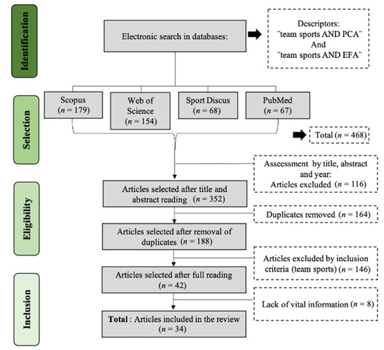 A systematic electronic search was computed from PubMed (n = 67), Web of Science (n = 154), SPORTDiscus (n = 68) and Scopus (n = 179) on 1 November 2019 before 9:00 a.m., in order to identify studies that use the PCA in team sports as a data reduction technique. The authors were not blinded to journal names or manuscript authors. The search strategy combined terms covering the topics of the population (“team sport,” soccer, football, basketball, rugby) and intervention (PCA; “principal component analysis”, “exploratory factor analysis”). The search was made using combinations of the following terms linked with the Boolean operators “AND” (inter-group Boolean operator) and “OR” (intra-group Boolean operator, only for the second). Studies were included if PCA was made in the most-studied team sports (soccer, rugby, or basketball) following previous research [16].