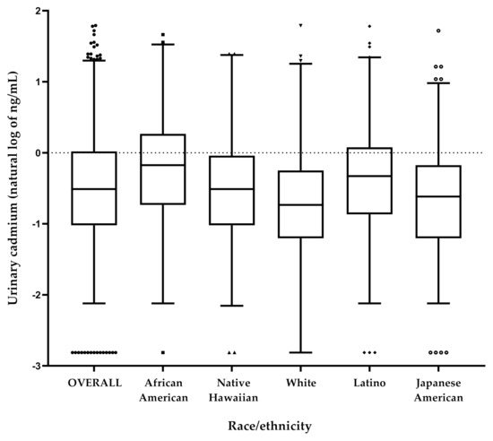 Therefore, we aimed to analyze urinary Cd in current smokers at the time of urine collection from five different race/ethnicity groups from the MEC [1,22]. In addition, to address the growing concerns about the health effects of environmental Cd exposure and the reported variability of burden by race/ethnicity, we leveraged available self-reported occupation data to investigate the potential association of urinary Cd levels with relevant occupational categories after accounting for internal nicotine dose and self-reported smoking duration.