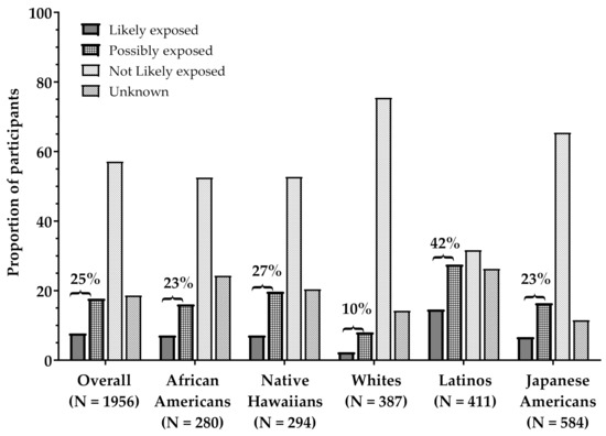 Proportion of Multiethnic Cohort (MEC) current smokers overall and within each racial/ethnic group assigned to occupational Cd exposure categories. Bracketed percentages represent the sum of Likely exposed and Possibly exposed in each group.