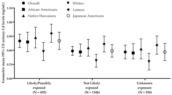 The relative proportion of participants within each occupational Cd exposure category differed by race/ethnicity (p < 0.001; Figure 2). Notably, a greater proportion of Latinos (42%) and Native Hawaiians (27%) were in the “Likely exposed” and “Possibly exposed” occupational Cd exposure categories. A greater proportion of all Whites (76%) and Japanese Americans (65%) were in the “Not Likely exposed” occupational Cd exposure category. To account for the observed impact of self-reported occupation on urinary Cd, we further adjusted for occupational Cd exposure categories to calculate the geometric mean levels of urinary Cd by race/ethnicity. The differences across populations were similar to that without adjustment for occupational Cd exposure categories but were slightly attenuated in Latinos (Table 3). The highest geometric mean level of urinary Cd was observed in Latinos (0.864 ng/mL), followed by Native Hawaiians (0.836 ng/mL), Japanese Americans (0.813 ng/mL), African Americans (0.806 ng/mL) and lowest in Whites (0.743 ng/mL; Table 3). Additionally, Latinos had the highest level of urinary Cd across all occupational categories (Figure 3). There was no evidence of an interaction between occupational Cd exposure categories and race/ethnicity on urinary Cd levels in any of the analyses (p = 0.240).