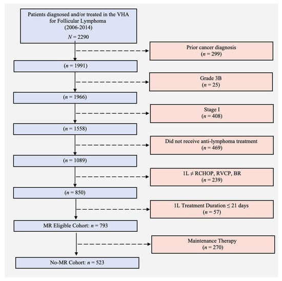 Study cohort attrition. 1L: first-line treatment; BR: bendamustine and rituximab; MR: maintenance rituximab; RCHOP: rituximab, cyclophosphamide, doxorubicin, vincristine, and prednisone; RCVP: rituximab, cyclophosphamide, vincristine, and prednisone; VHA: Veterans Health Administration.