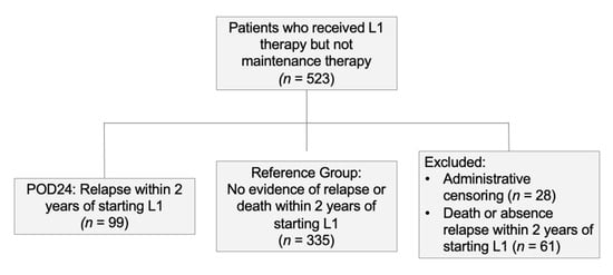 The dataset included 523 patients, with 1933 variables. Median follow-up time was 5.03 years, and median survival time 9.32 years. At five years, 150 (28.68%) patients had died, 111 (21.22%) patients had been administratively censored at the end of the study observation period, and 262 (50.10%) patients were alive. Within two years, 99 patients (22.81%) experienced progression of disease (POD24). As in Casulo et al. [], we excluded from our POD24 analysis 89 patients who were administratively censored (n = 28) or died (n = 61) from causes unrelated to their disease relapse, to the best of our knowledge. Figure 2 illustrates cohort distribution for POD24 and reference groups.