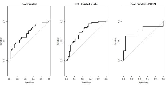 Receiver operating characteristic (ROC) curves are presented in Figure 3 for the Cox model applied to curated set, RSF model applied to the curated + labs set, and Cox model applied to the curated + POD24 dataset. The ROC curves show the tradeoff between sensitivities and specificities for each model.