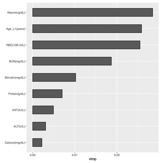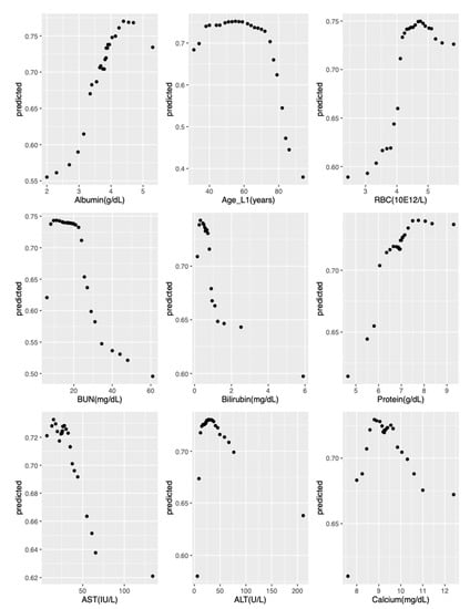 Figure 4 provides variable importance plots for the RSF model applied to the curated + labs set. The nine most influential predictors were examined with partial dependence plots to explore their relationship with predicted survival probabilities. These nine most important variables, in order of decreasing influence, were albumin, age at L1 initiation, erythrocytes, urea nitrogen, bilirubin, protein, aspartate aminotransferase, alanine aminotransferase, and calcium. Figure 5 provides partial dependence plots for these nine variables. The vertical axis shows the predicted survival probability, and the horizontal axis indicates change in predictor values. The partial dependence plots illustrate that the predicted survival probabilities decrease with age above 60 years, dropping faster with age over 70 years. Similarly, survival decreased as albumin and erythrocytes decreased and urea nitrogen, bilirubin, protein, aspartate aminotransferase, alanine aminotransferase, and calcium increased beyond their respective normal ranges, indicating worsening renal (urea nitrogen), liver (albumin, bilirubin, alanine aminotransferase), and marrow (erythrocyte, hemoglobin) functions.