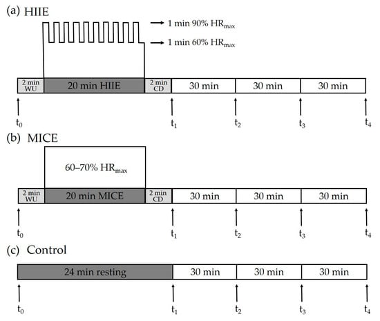 The study was conducted using a within-subjects, repeated-measures design. It included one HIIE session, one MICE session, and one control session conducted in a counterbalanced order. These three sessions were separated by at least one week and were completed at approximately the same time of the day. Before the experiment, participants completed the Physical Activity Readiness Questionnaire (PAR-Q) [], which identifies potential risk factors. Participants were asked to complete the flanker task before the intervention (t0) and at four time points after the intervention, including immediately (t1), 30 min (t2), 60 min (t3), and 90 min (t4).