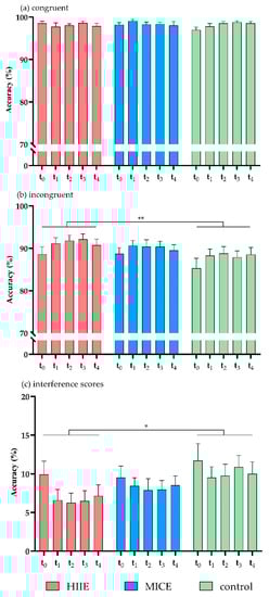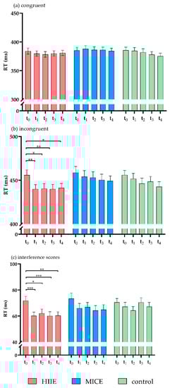 There was a significant interaction between time point and congruency (F(4, 37) = 5.65, p = 0.001, η2 = 0.38). The post hoc test showed that, for incongruent trials, RT was significantly slower before intervention (t0) compared to immediately after intervention (t1) (p = 0.02) and at 30 min (t2) (p = 0.004), 60 min (t3) (p = 0.006), and 90 min (t4) (p = 0.003) after intervention. No significant differences were observed between the time points for congruent trials (p > 0.5 for all). There was a significant interaction effect for session × time point × congruency (F(8, 33) = 2.51, p = 0.03, η2 = 0.38). Contrasts in the interactions between session, time point, and congruency revealed that RT was significantly slower in incongruent trials before the HIIE intervention (t0) compared to immediately after the HIIE intervention (t1) (p = 0.002) and at 30 min (t2) (p = 0.018), 60 min (t3) (p = 0.003), and 90 min (t4) (p = 0.045) after the HIIE intervention. No significant differences were detected between time points for incongruent trials in the MICE and control sessions (p > 0.063 for all). For the RTs of congruent trials, no significant differences were detected between the time points in any of the sessions (p > 0.085 for all). There was no significant main effect for session (F(2, 39) = 1.76, p = 0.186, η2 = 0.08) or significant effects in the interactions of session × congruency (F(2, 39) = 2.69 p = 0.081, η2 = 0.12) or session × time point (F(8, 33) = 1.24, p = 0.309, η2 = 0.23) (Figure 3a,b).