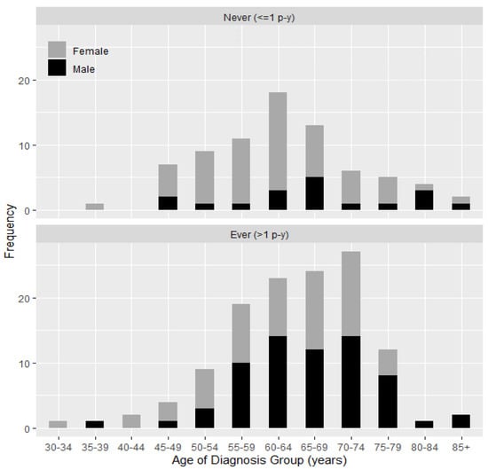 Importantly, our population with lung cancer included over 50% women. Women with lung cancer were slightly younger than men, with lung cancer diagnoses identified in some individuals in their 30s (youngest age of lung cancer diagnosis was 34 years for women and 38 years for men). These data are consistent with findings in the U.S. population in which lung cancer, which is rare in adolescents and young adults, is higher in women in their 30s compared to men []. We did not detect a difference between WTC dust cloud exposure on 11 September between women and men. Many more women were never-smokers compared to men, consistent with national cancer statistics []. Because of the self-selected nature of our cohort, it would not be appropriate to make direct comparisons between our population and general population. However, the suggested differences require further investigation.