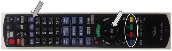 A Hybridcast service combines programs broadcast over airwaves with broadband data provided via the Internet to impart a variety of services (Figure 1). In our survey, during the broadcast of the TV program, the TV anchor announced and introduced the start of the Hybridcast system. Questions were provided one by one by the TV anchor. Participants started responding to questions when requested, by pressing the ‘d button’ (data button) on the remote controller to start the Hybridcast system (Figure 2). Questions provided either had responses as a selection of one item out of four answering items or as a selection of one item from a pull-down list. Participants could select one of the four-coloured buttons, followed by pressing the ‘enter’ button to answer the four-choice questions. The other questions could be answered by selecting an item from the pull-down list by using the ‘up’ and ‘down’ arrows (left and right to the ‘enter’ button) and, then, pressing the ‘enter’ button. Participants could answer through the Hybridcast system during the broadcast of the TV program. Participants could also respond through their own PCs, tablets, or smartphones at any time after the broadcast of the TV program [18].