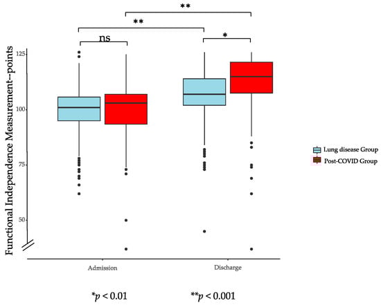 Functional Independence Measurement of post-COVID-19 group and lung diseases group. ns: no significative.