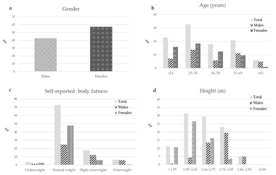 - General standard information, i.e., gender, age and height (from the NMQ). Weight information was replaced by the authors with a question on self-reported body fatness [,] and the following parameters were implemented by authors in the NMQ, namely: