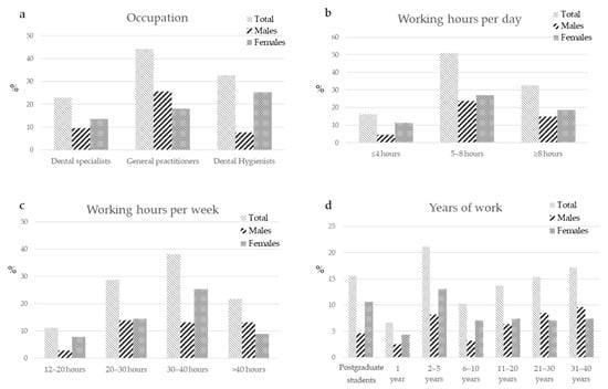 Occupational distribution of surveyed operators, expressed in percentages. (a) The population was constituted by a higher percentage of general practitioners (approximately 50%), followed by dental hygienists (approximately 30%) and dental specialists (approximately 20%). (b) Most of the operators worked more than 5 h per day and (c) more than 30 h/week. (d) The years of work was uniformly distributed.