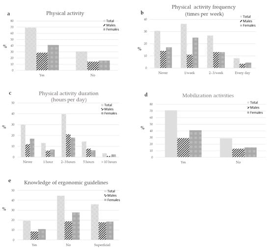 The most reported physical activity frequency and duration were 1 time per week and 2–3 h per week (Figure 3c). Operators declared to perform some mobilization activity (approximately 70%) (Figure 3d).
