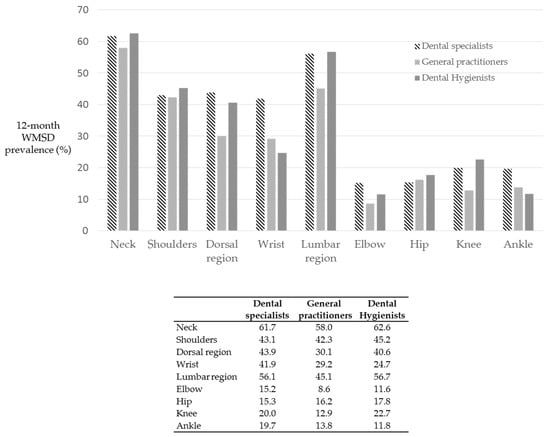 Figure 5 reports the distribution of WMSD according to dental occupation.