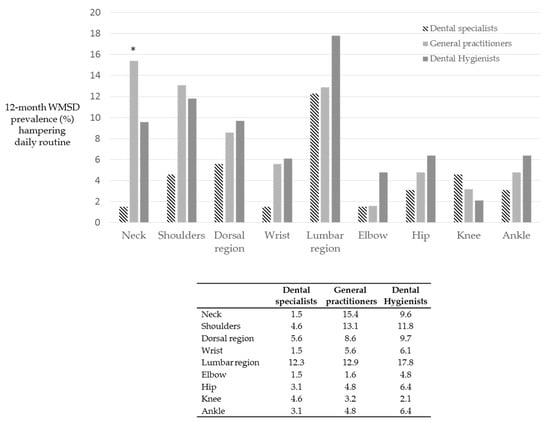 WMSD in the lumbar region was present in 52.2% of the 284 surveyed dental professionals. This region was equally affected in all the 3 dental workers groups (dental specialists, general practitioners and dental hygienists). Females and males dental professionals showed comparable percentages of WMSD. A similar trend is reported in previous studies [,].