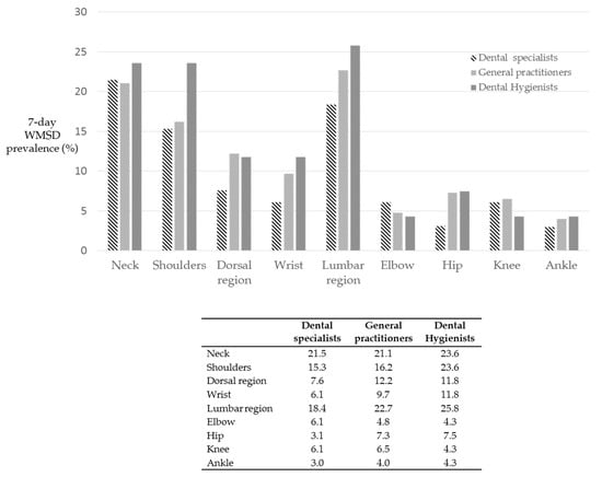 A large portion of surveyed dental professionals (approximately 40%) declared the presence of WMSD in the last 7 days. These data are lower than that reported in literature. A recent paper showed that approximately 60% of surveyed dentists experienced one or more WMSD in the last 7 days [].