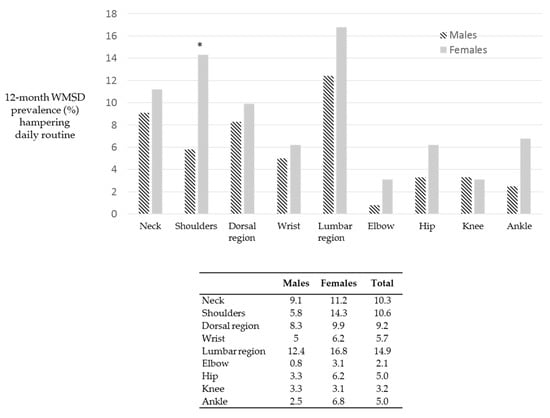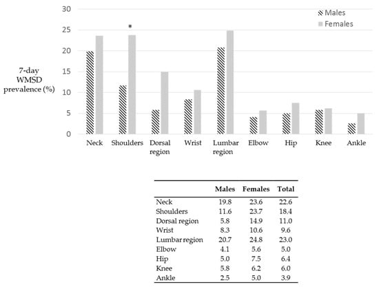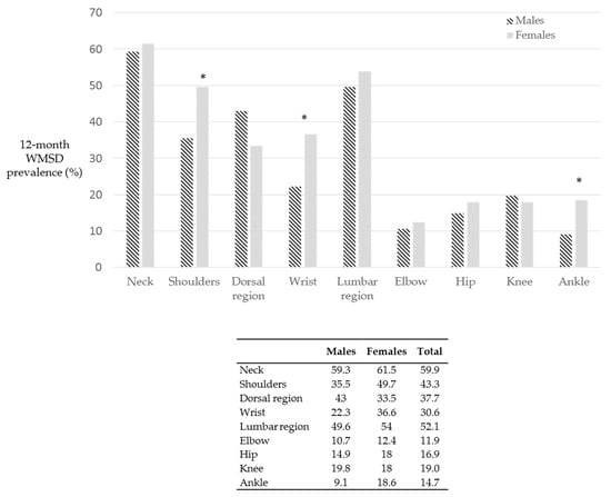 Prevalence of WMSD in the past 12 months according to anthropometric parameters (statistical significance for p < 0.05). Females showed a significantly higher percentage of WMSD when compared to males (p < 0.05).