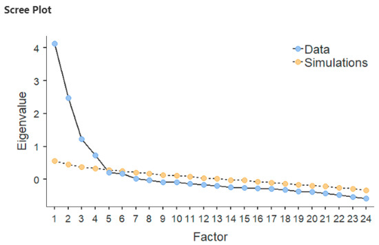 The Kaiser Meyer Olkin (KMO) test and Bartlett’s test of sphericity were run to assure that the correlational matrix could be used to perform Factor Analysis. KMO (0.84) should be >0.5, and the Bartlett’s test should be significant. EFA with Promax oblique rotation was used to analyse the items on the FPEB (using IBM SPSS Statistics) because there was theoretical reason to believe the extracted factors were related [32,33]. Initially all 45 items were included. Subsequent factor analyses were conducted in a stepwise fashion to eliminate items until a stable factor solution emerged. In order to select the items to be retained, items with loadings < 0.32 and items with loadings > 0.32 on more than one factor were excluded see Ref. [70] because the factor loadings cut-off score of 0.32 (or above) is generally considered substantial. However, determining the number of factors to be retained judging the elbow of a scree plot could reflect a sampling error, whereas the rule “eigenvalue greater than one” tends to retain too many factors [71,72]. For this reason, we also conducted a parallel analysis with Horn’s method [73] using Jamovi Software.