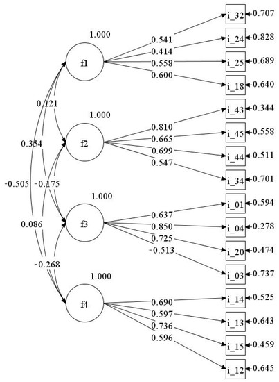 CFA of the Family, Peers, and Externalising Behaviour (FPEB) scale; N = 388. Items i_3, i_12, i_13, i_14, i_15, i_34, i_43, i_44, i_45 are reverse items. f1 = “Externalising behaviour”, f2 = “Peer relations difficulties”, f3 = “Family conflict”, f4 = “Lack of family negotiation”.