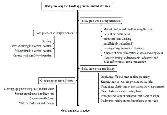 Figure 1 summarizes the identified beef processing and handling practices in the two slaughterhouses and the beef retail shops evaluated in the study.