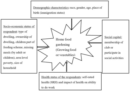The theoretical justification of the relationships we investigated are demonstrated in the conceptual framework presented in Figure 1. The study is underpinned by the theory that presupposes that growing food or vegetables (also known as home food gardening) is influenced by the following covariates: social capital, socio-economic factors, demographic factors, and the health status of the respondents.