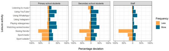 Figure 1. Deviations of time spent on leisure activities within the preceding 14 days compared to pre-pandemic times. Note: missing values to 100% reflect no change of activities.