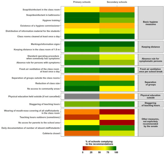 Figure 2. Heat map with percentage of implementation of the preventive measures in classes, stratified by the main aspects of the senate’s recommendations valid in June 2020.
