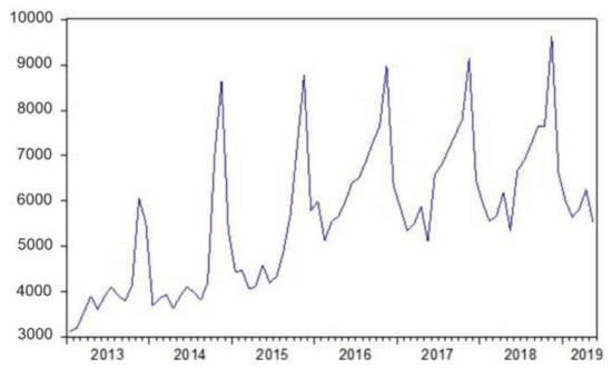 An autoregressive integrated moving average (ARIMA) model [,], was also created to predict the demand for dark tourism in Córdoba, a province located in southern Spain. According to Gujarati [], the facilitating factor of this prediction method is in an analysis of the probabilistic, or stochastic, properties of the economic time series (in this case, the number of dark tourists in Cordoba). In the time series models, the dark tourist variable can be explained over time by its past or lag values and by the stochastic error terms, giving ARIMA models an advantage of being less costly in data collection, as only historical observations of the data are required. In contrast, the main limitation of using univariate analysis is that it does not recognize any causal relationship with the behaviour of other endogenous variables or information related to the behaviour of other explanatory variables. The SARIMA models (p,d,q) × (P,D,Q)s are described by the following expressions: