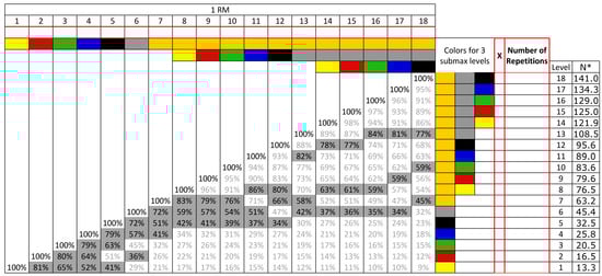 Color codes and levels of resistance of the elastic bands. One RM (one-repetition maximum) is the maximum load/resistance that an individual can lift just once with proper technique in the entire range of motion of the exercise. Top row: 1 repetition on each level until 1 RM is found. First column on the right (marked with red): Tick the intensities closest to 40, 60, and 80% (highlighted in gray in main table). Second column on the right (marked with red): Number of performed repetitions on each of the 3 levels to exhaustion. * Resistance in Newtons at 100% stretch length of the elastic band.