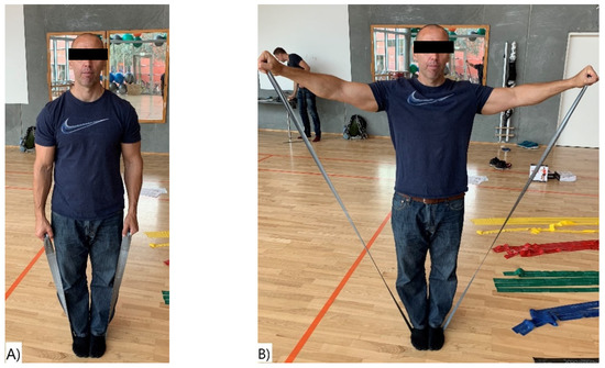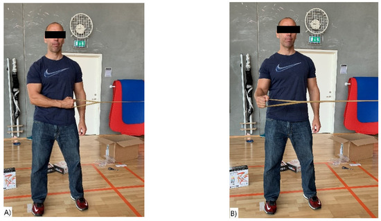 In the starting position, the participants were instructed to stand with feet together in the middle of the elastic band and to grab each end loop with their left and right hand (Figure 2A), with arms alongside the body. The participants were instructed to perform a standing bilateral shoulder lateral raise to 90° shoulder abduction angle and held for 1 s (Figure 2B). Correct shoulder angle was insured with visual inspection by the test leader.