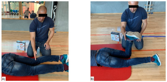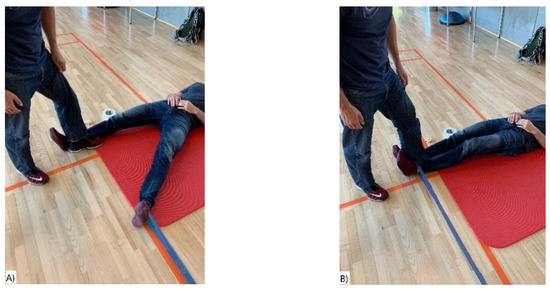 In the starting position, the participants were in a supine position parallel to the wall, with feet apart and the elastic band around the ankle of the dominant leg. The end position was when the dominant leg was touching the foot of the person helping to secure the position (Figure 4A,B).