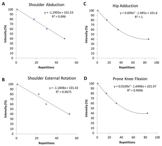 (A–D) The association between repetitions and intensity for upper and lower body exercises, fitted with 1st order polynomial ((A) Shoulder Abduction and (B) Shoulder External Rotation)) and 2nd order polynomial ((C) Hip Adduction and (D) Prone Knee Flexion)), respectively.