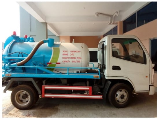 Globally, more than 2.7 billion people are reliant on-site sanitation systems (OSSs), predominantly, septic tanks and pit latrines, and the number is expected to rise to 4.9 billion by 2030 []. A mixture of human waste, water, and any other materials are disposed of and stored in pits, tanks, or vaults of OSSs is faecal sludge (FS). FS should be properly contained and safely managed to minimise environmental pollution and reduce public health risks. Faecal sludge management (FSM) is a systematic approach of dealing with FS, which typically follows five components of sanitation service/value chain (i) containment (ii) emptying (iii) transport (iv) treatment (v) reuse and disposal. The current need of FSM worldwide, particularly in lower and middle-income countries, is large and inequitably distributed amongst the poorest households in both rural and urban areas []. Effective FSM service delivery requires proper containment of OSS, emptying of OSSs, and subsequent transport to treatment and safe disposal [], which will ensure that FS is safely collected and disposed, and not simply relocated from OSS to the immediate environment. Emptying and transport (E&T) of FS is an important component in FSM, which is provided by different stakeholders, e.g., private sector, informal sector, Non-Governmental Organisations (NGOs), local government, etc. In major cities across Africa and Asia, the most common emptying technologies constitute mechanised and semi-mechanised technologies []. Some of the mechanised technologies include conventional vacuum tanker, cesspool truck, and vacutug, whereas semi-mechanised technology options include manual pit emptying technology (MAPET) and Gulper []. In most developing countries, there is a lack of governing policies or regulatory framework on FSM, and FS E&T services are often provided without adequate technology, regulations, and safety precautions [].