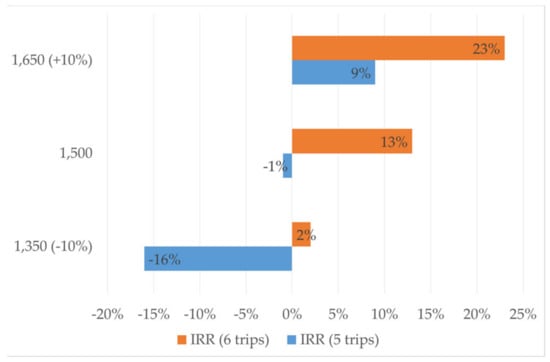 Table 3 shows calculations of the financial analysis and reveals that, making six trips per day, the business could be financially viable (IRR—13%, discount rate—6.5%) with an emptying fee of BDT 1,500 (USD $18) per trip (per 2 m3). A substantial revenue generated by a high number of emptying services, low loan repayment due to low interest rate, and low maintenance expenses (as the vacutug is new) are some of the major reasons for positive net present value (NPV), and IRR higher than the discount rate. A similar analysis was done for emptying services of an NGO in Dhaka, which discovered that both NPV and IRR were negative, primarily due to a high loan repayment []. It has been established that higher emptying frequency and higher emptying fee results in increased profits of the emptying business []. The study found that, at the same emptying fee, IRR is negative (−1%) when it makes five trips per day (Figure 4). The analysis also showed that a change in +/− 10% in the emptying fee could have a significant impact on IRR, as seen in Figure 4. An increase of 10% in the current emptying fee could ensure that the business could be financially viable (IRR—9%, discount rate—6.5%), even with five trips per day. Considering an average desludging frequency of 3 years, a 1.96 m3 average pit volume, and willingness to pay in the range of BDT 50—250 (USD $0.6–3.0) per month, an emptying fee of BDT 1,650 (USD $20) per trip (per 2 m3) is even less than the minimum emptying fee that households are willing to pay.