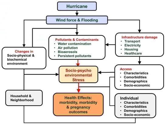 Hurricane Maria, which impacted Puerto Rico in 2017, accounted for $94.5 billion USD in economic losses and 146 deaths [,]. However, these estimates can be subject to downward bias and do not fully account for indirect economic costs and disease and disability burden associated with hurricanes. For example, research suggests that the estimated death toll in Puerto Rico associated with Hurricane Maria was 2975, against 64 reported officially []. While the direct economic losses and loss of lives have been subject to accounting, the indirect health effects of hurricanes and their persistence over time have been challenging. Most indirect health impacts of hurricanes can be attributed to new or modified environment stressors caused by hurricanes because hurricanes change socio-physical and biochemical environmental stressors in the affected areas. To tease out the precise health impacts of hurricanes, it is important to understand direct and indirect linkages between hurricanes, environmental stressors and human health, as demonstrated in Figure 1.