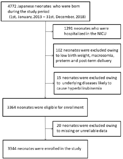 Japan is an island country running from north to south along East Asia’s Pacific coast, and Hamamatsu City is in the central region (latitude 34.7° north). The climate is relatively mild, with an annual average temperature of 16.6 °C. For this study, the seasons were divided into a warm season (April to September) and a cold season (October to March). The meteorological data on the day the neonates were born were obtained from the Japan Meteorological Agency website [], and the mean air temperature, mean relative humidity, mean barometric pressure, total precipitation amount and sunshine duration were noted. These data were collected at the Hamamatsu Local Meteorological Observatory, which is located approximately 1 mile from the hospital.