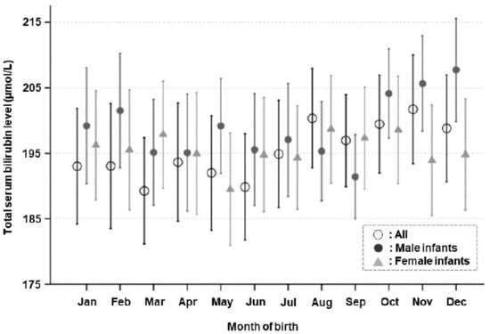 On a monthly basis, the TSB level peaked in December (median, 202 µmol/L) and was the lowest in July (median, 190 µmol/L; Figure 2), although the variation was not statistically significant. In male infants, the TSB level was the highest in December (median, 209 µmol/L) and the lowest in July (median, 190 µmol/L), which was found to be a significant difference (p = 0.04). Conversely, in female infants, the TSB level was the highest in March (median, 200 µmol/L) and the lowest in May (median, 188 µmol/L), but without significant variation. The TSB levels were significantly higher in the cold than in the warm season (p = 0.01; Table 1). When we compared seasonal differences according to sex, the TSB levels were significantly higher in the cold season in male infants (p = 0.001), whereas the difference was not significant in female infants (Table 2).